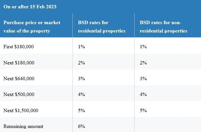 Prepare to meet the notorious SSD! Imposed by IRAS, this duty applies to both property buyers and sellers, with rates based on the property's purchase value. Take a look at the rates for residential properties after 15 Feb 2023 in the table below: